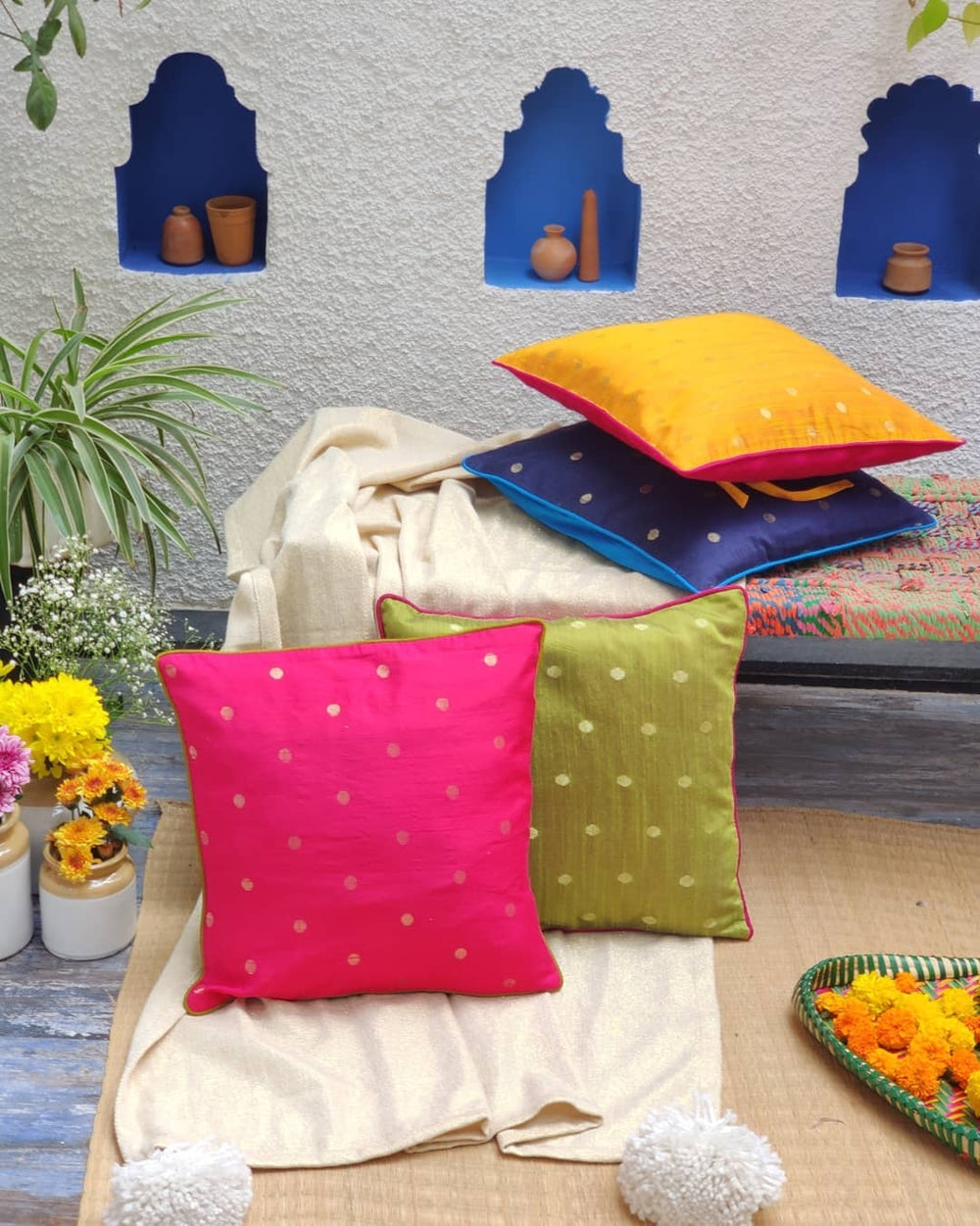 A curated trio designed to bring refined colour and character to interiors, this handcrafted set of three decorative cushion covers features a joyful blend of hues — 1 Yellow, 1 Bright Pink, and 1 Green. Crafted in cotton silk with intricately woven gold dot accents, each cushion is elevated by contrast piping and a playful tie-up closure at the back, marrying craftsmanship with thoughtful design.