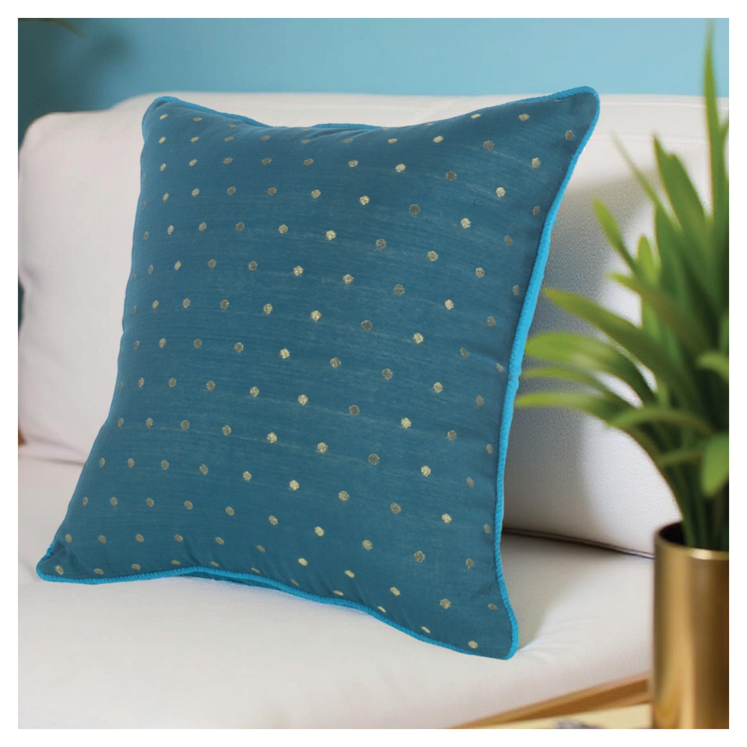 Featuring a rich cotton silk cushion in Teal with opulent gold dots woven intricately in the fabric , piping finish and a playful tie-up closure.