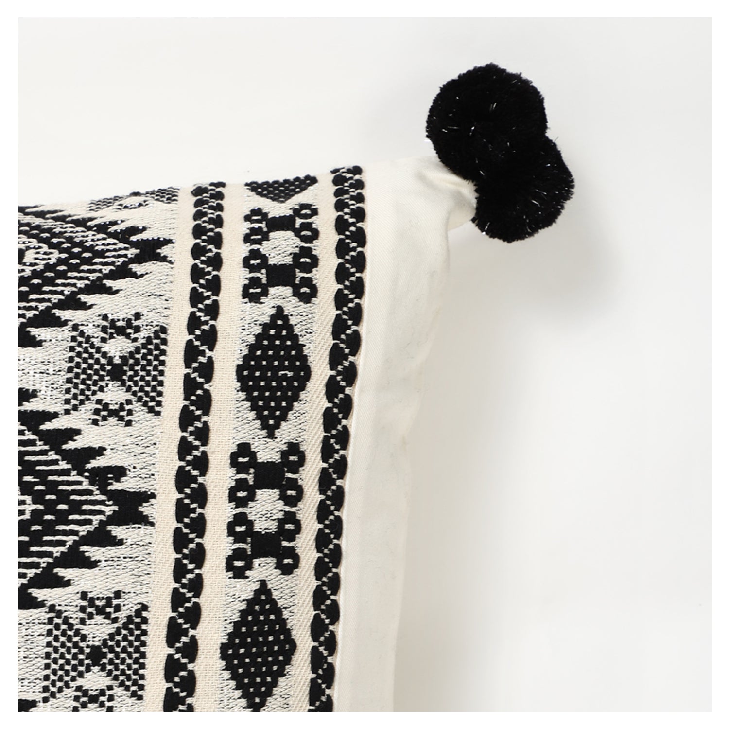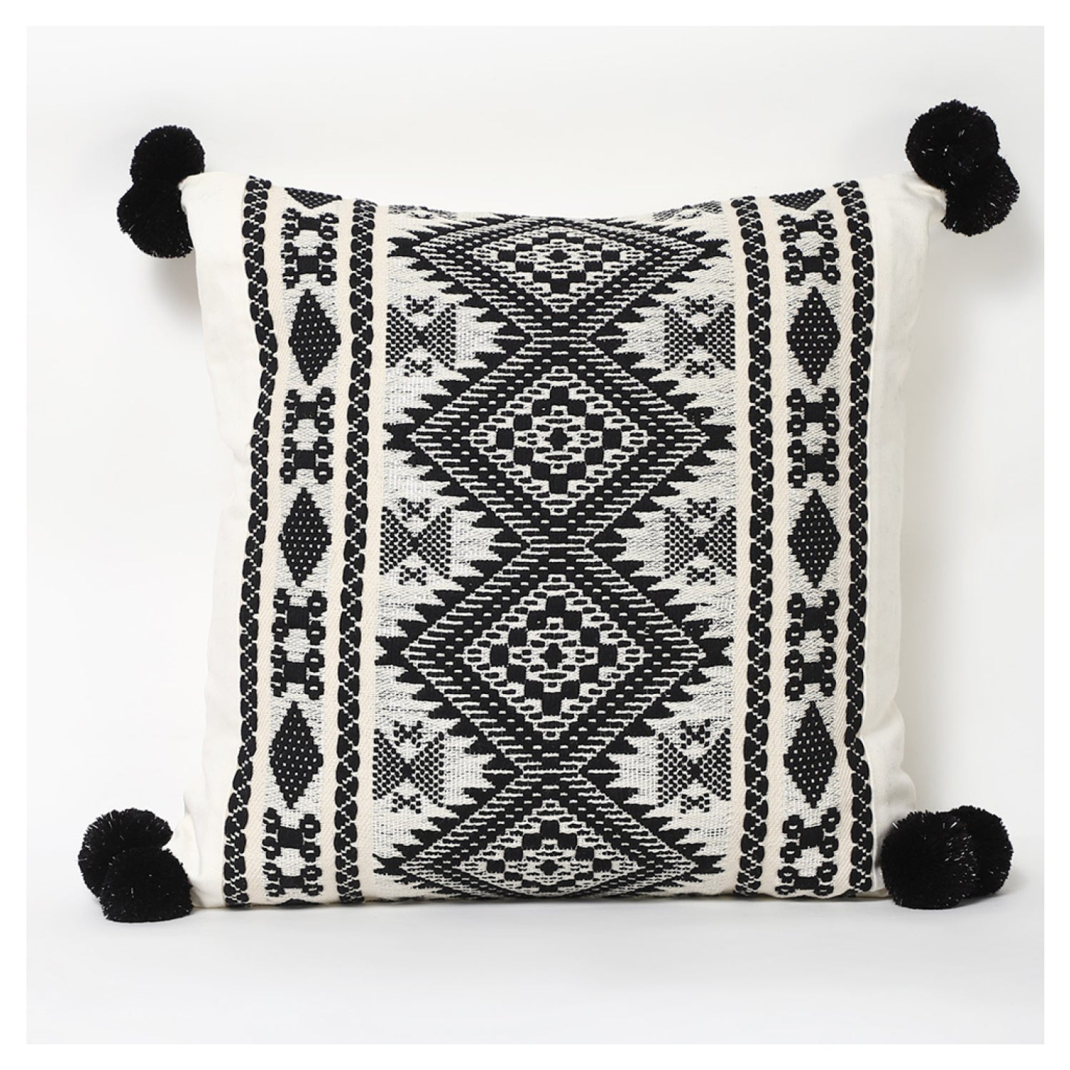 Featuring a striking black on white Aztec border, accented with handcrafted black and silver pompoms , this monochromatic cushion set is elegant and versatile – pairs beautifully with a variety of solid and embellished throw cushions.