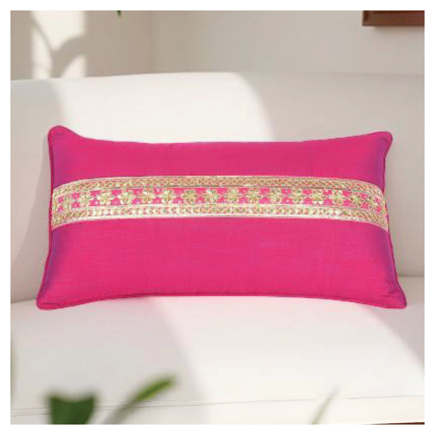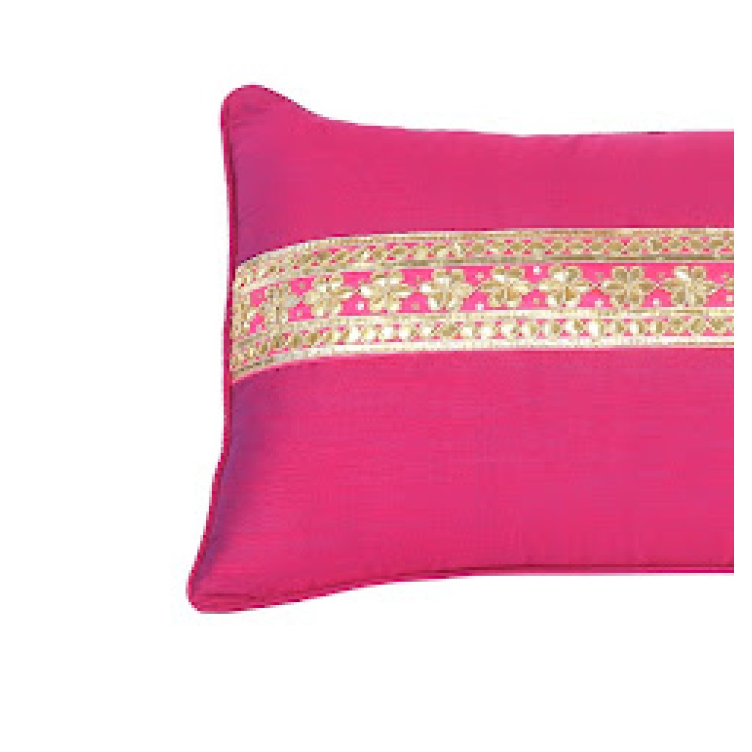 Featuring a vibrant Pink cotton silk cushion with a delicate yet opulent embroidered gota border, piping finish and a playful tie-up closure.