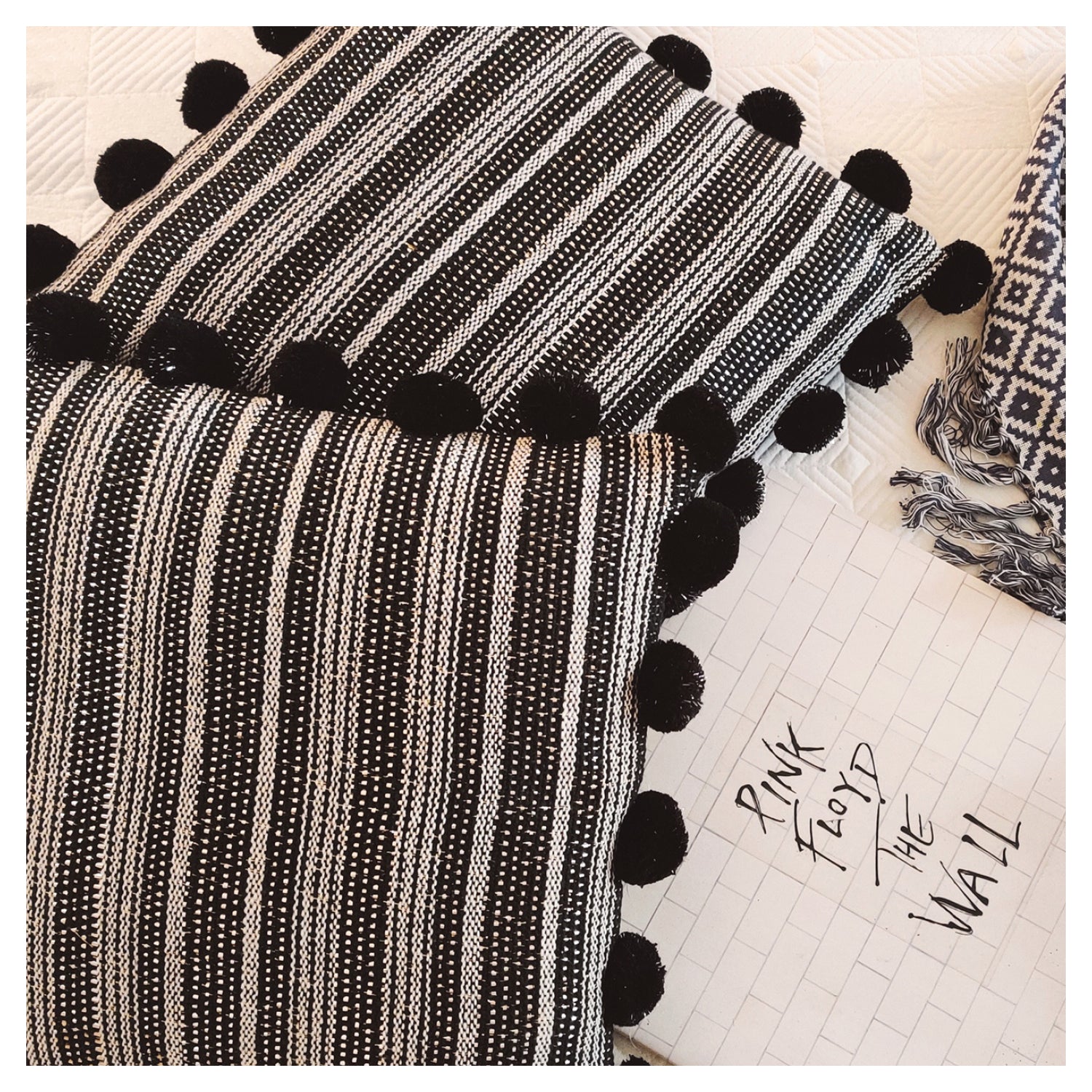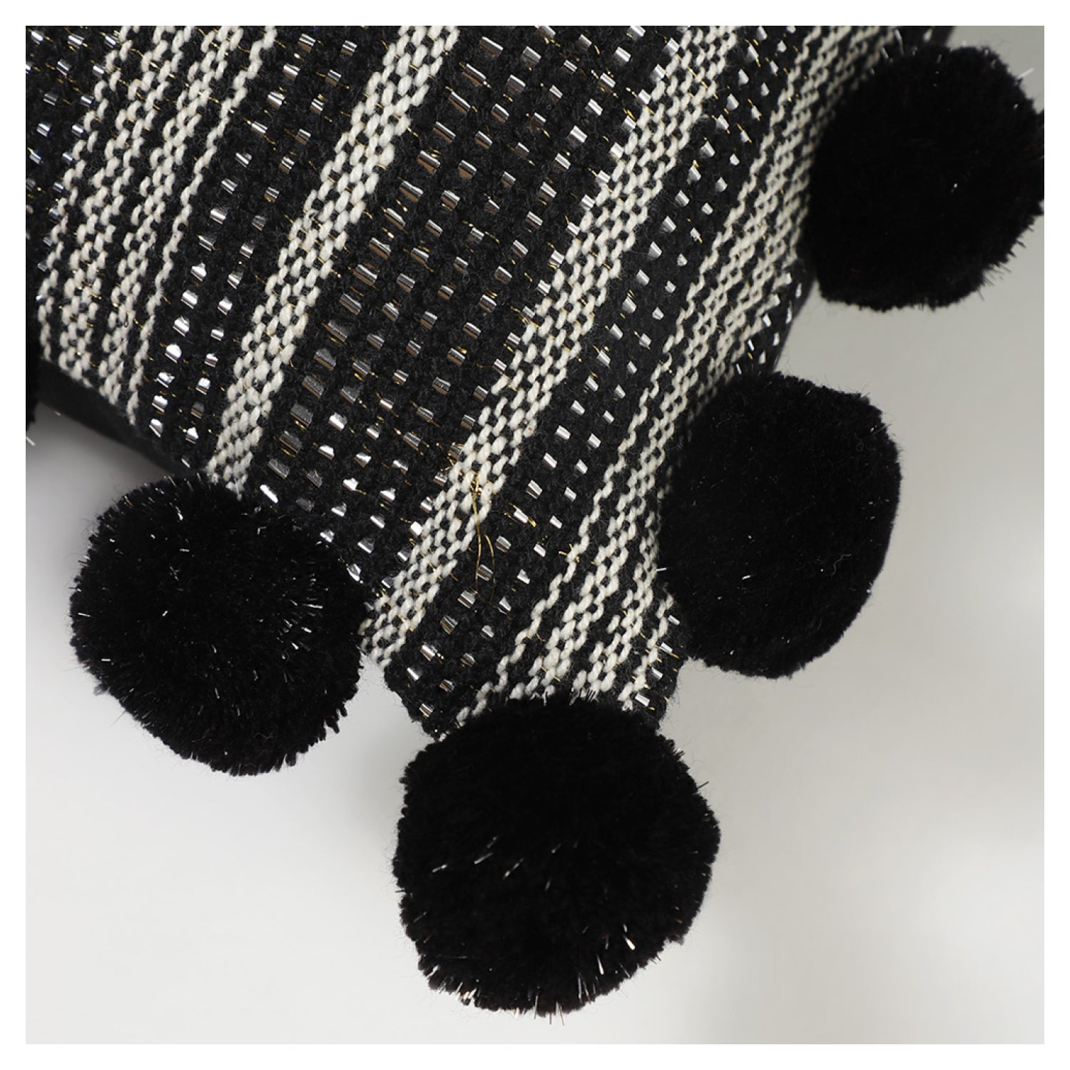 Dress up your couch with these shimmering black and silver textured cushions with unique pompom accents. Style them with our Aztec Border Cushion and Native Lumbar Pillow to make a sophisticated statement.