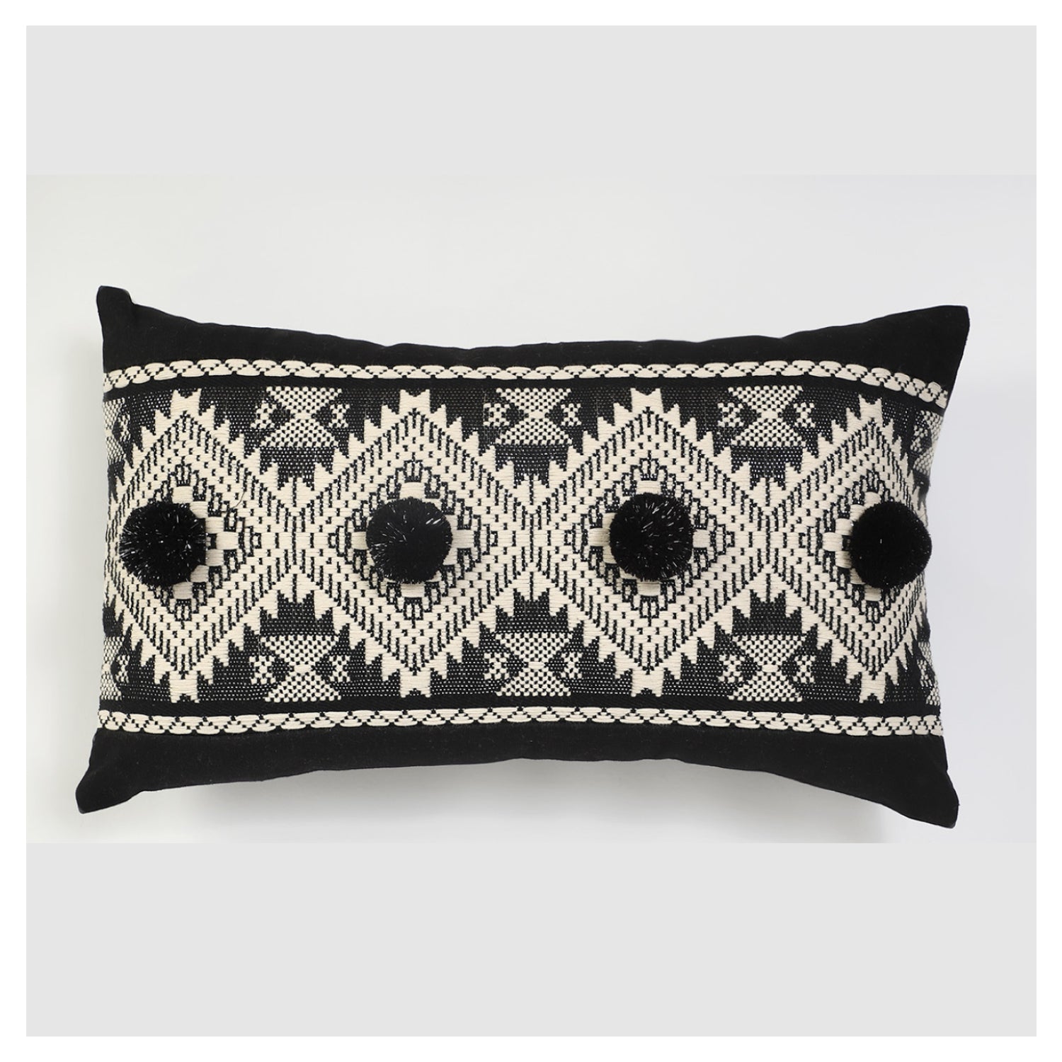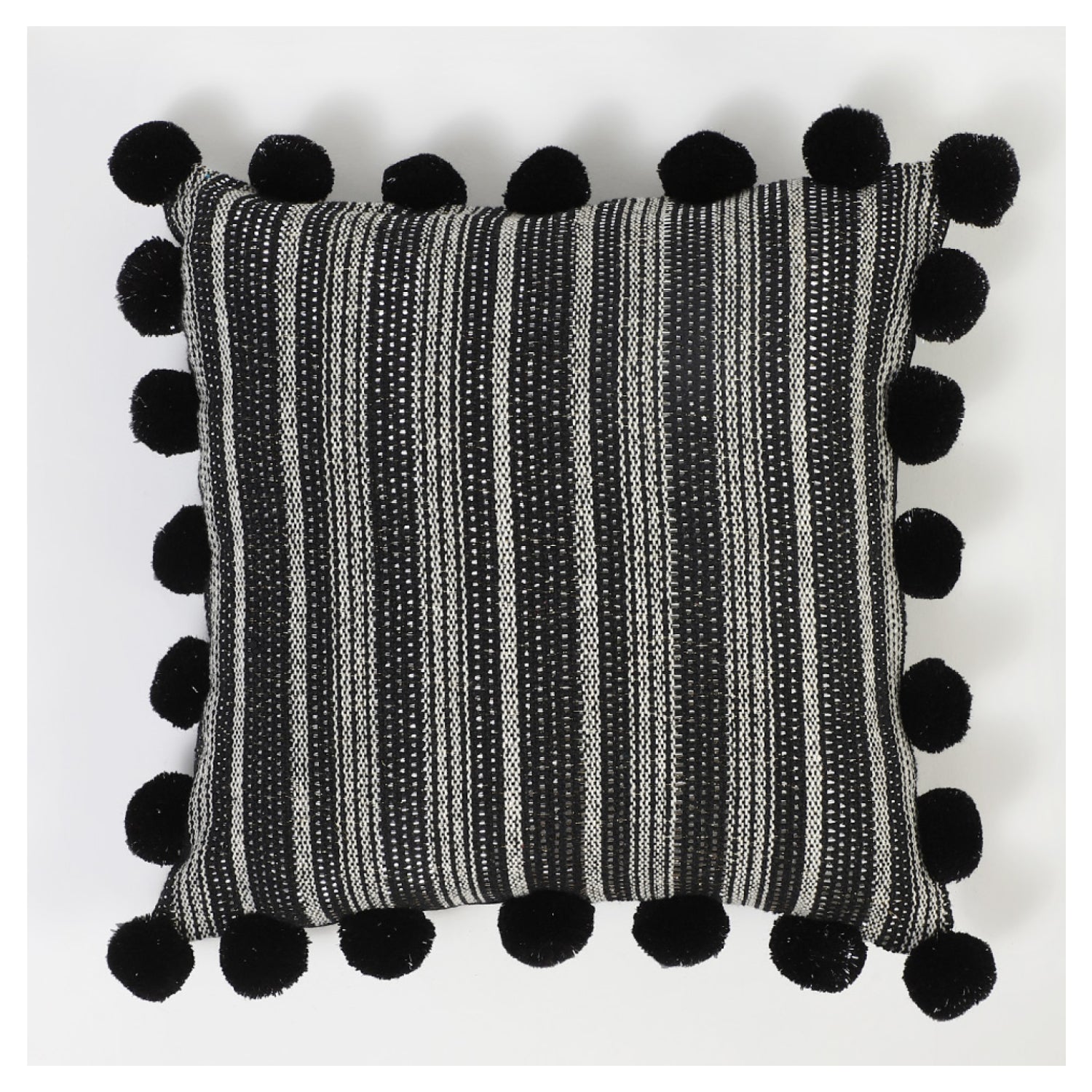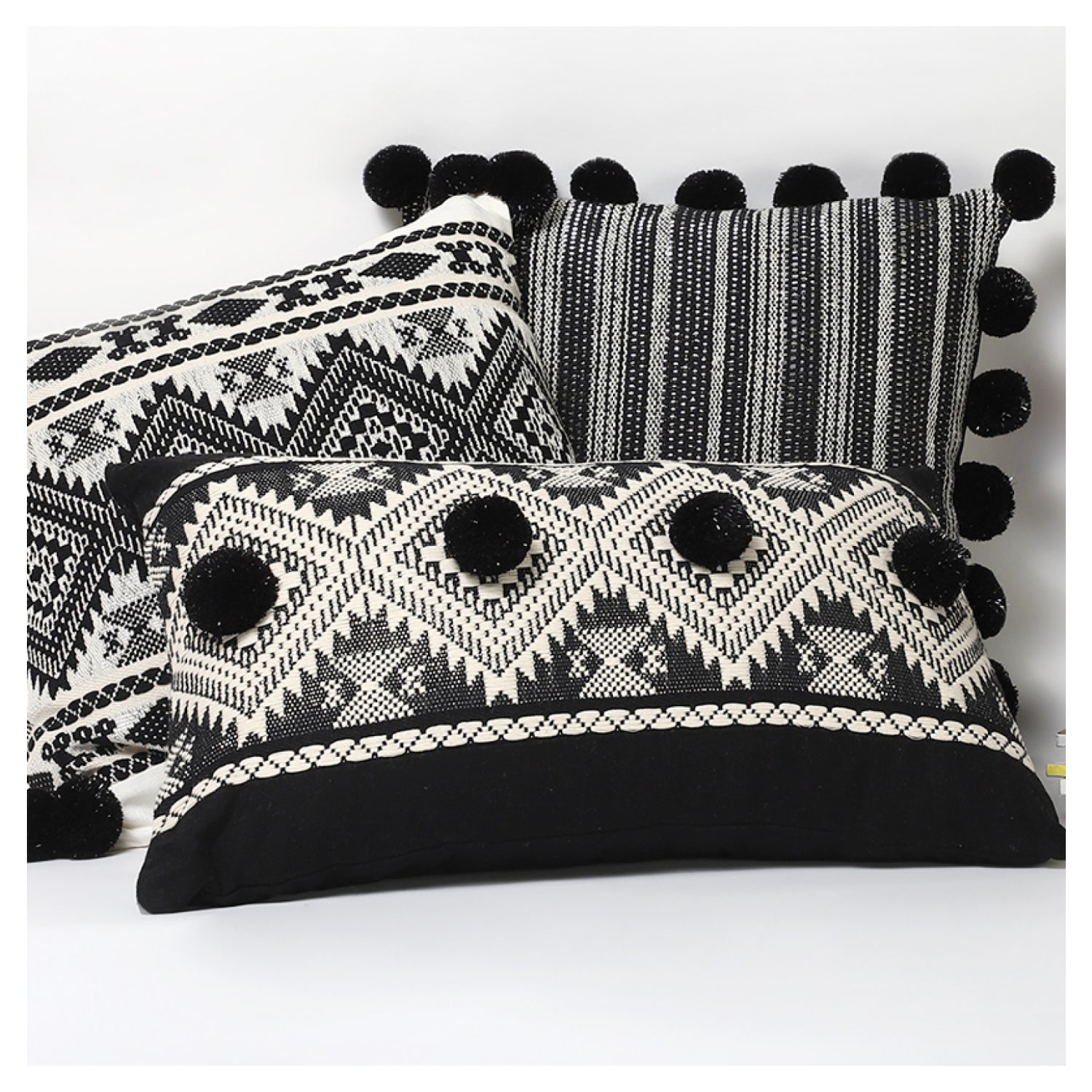 Featuring a striking black & white cotton jacquard cushion set, accented with handcrafted black and silver pompoms.