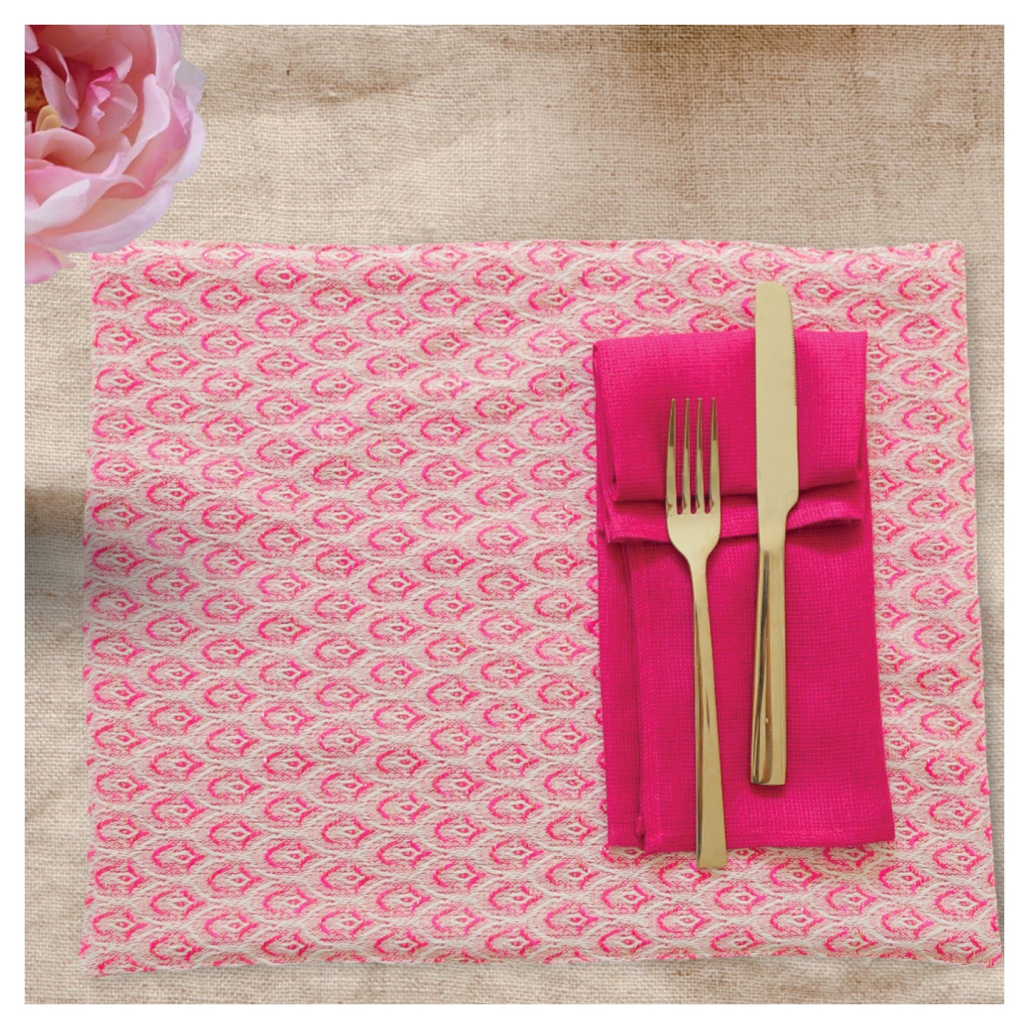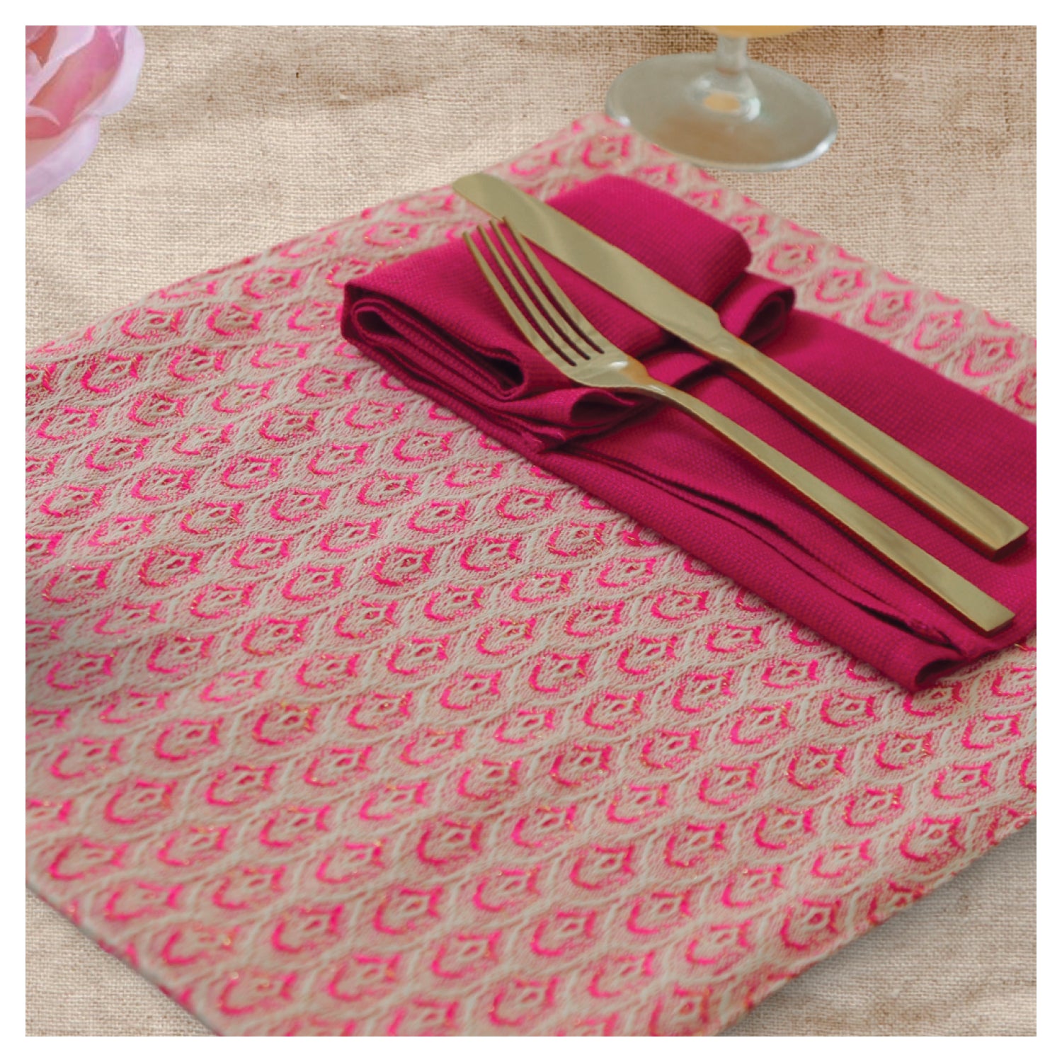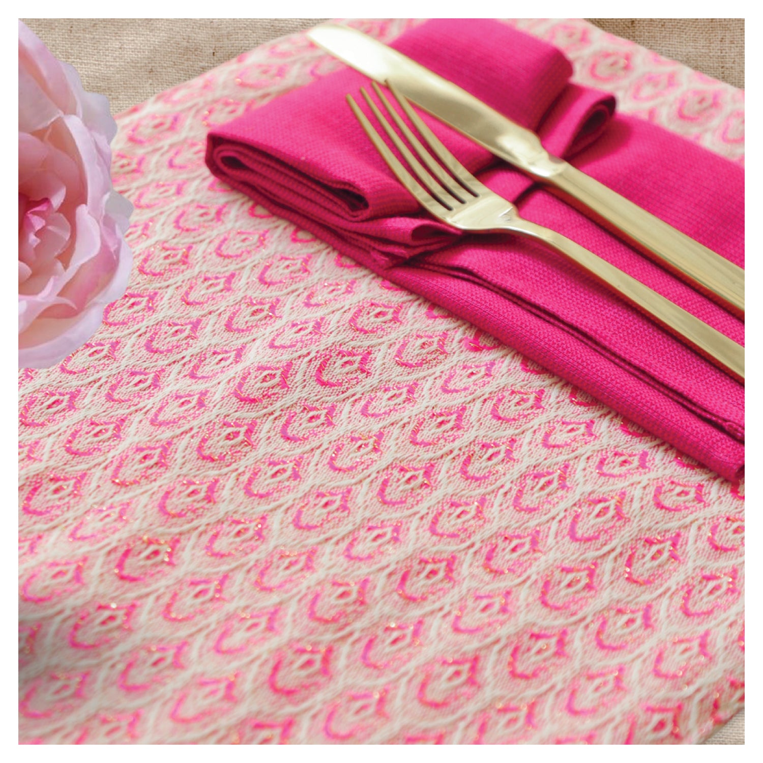 Featuring softly sparkling table mats in a woven pink scallop pattern. A quick and easy way to add color, texture and festivity to your table setting.