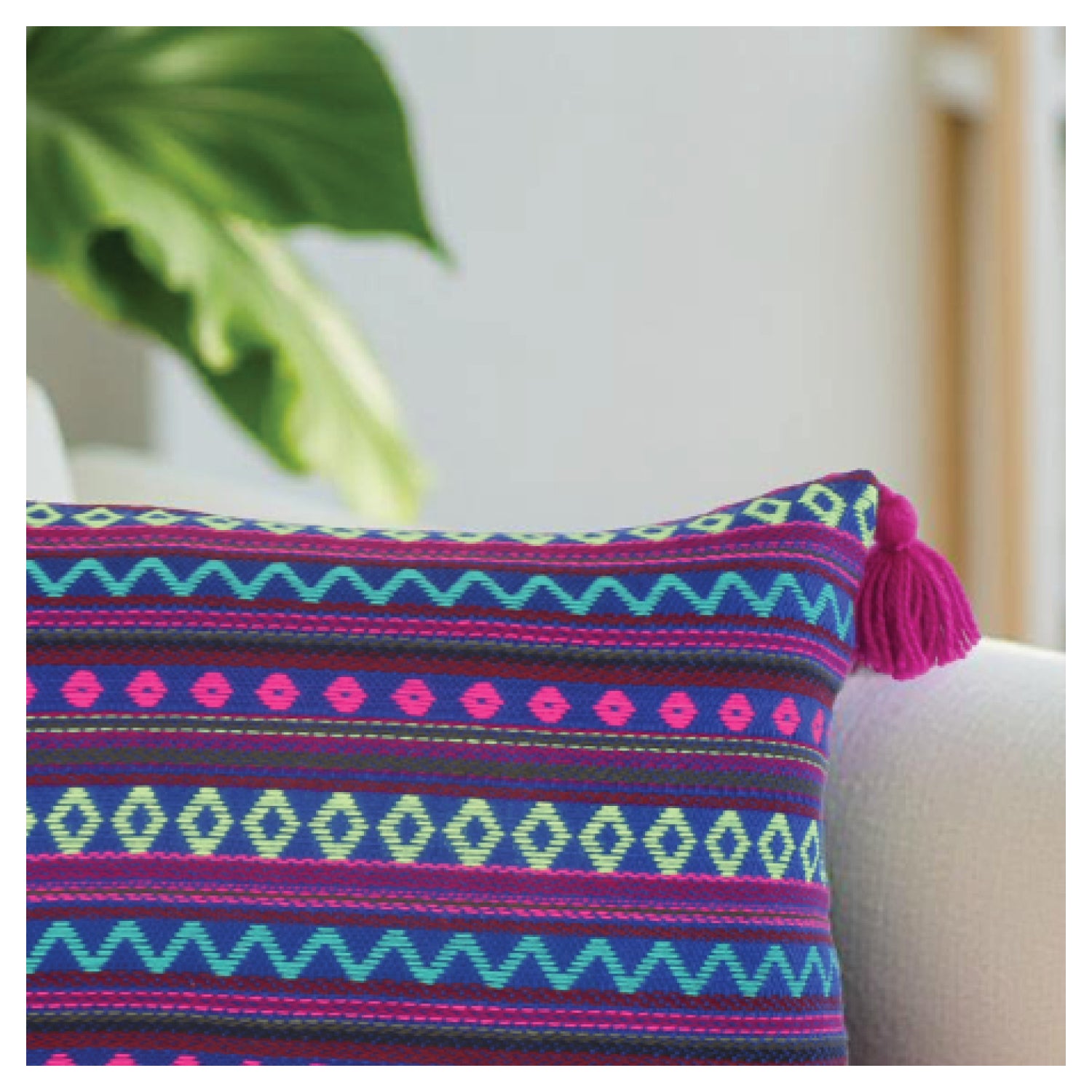 Featuring a vibrant cushion with a chevron striped geometric pattern in shades of Purple, Royal Blue and Pink , accented with handcrafted tassels.