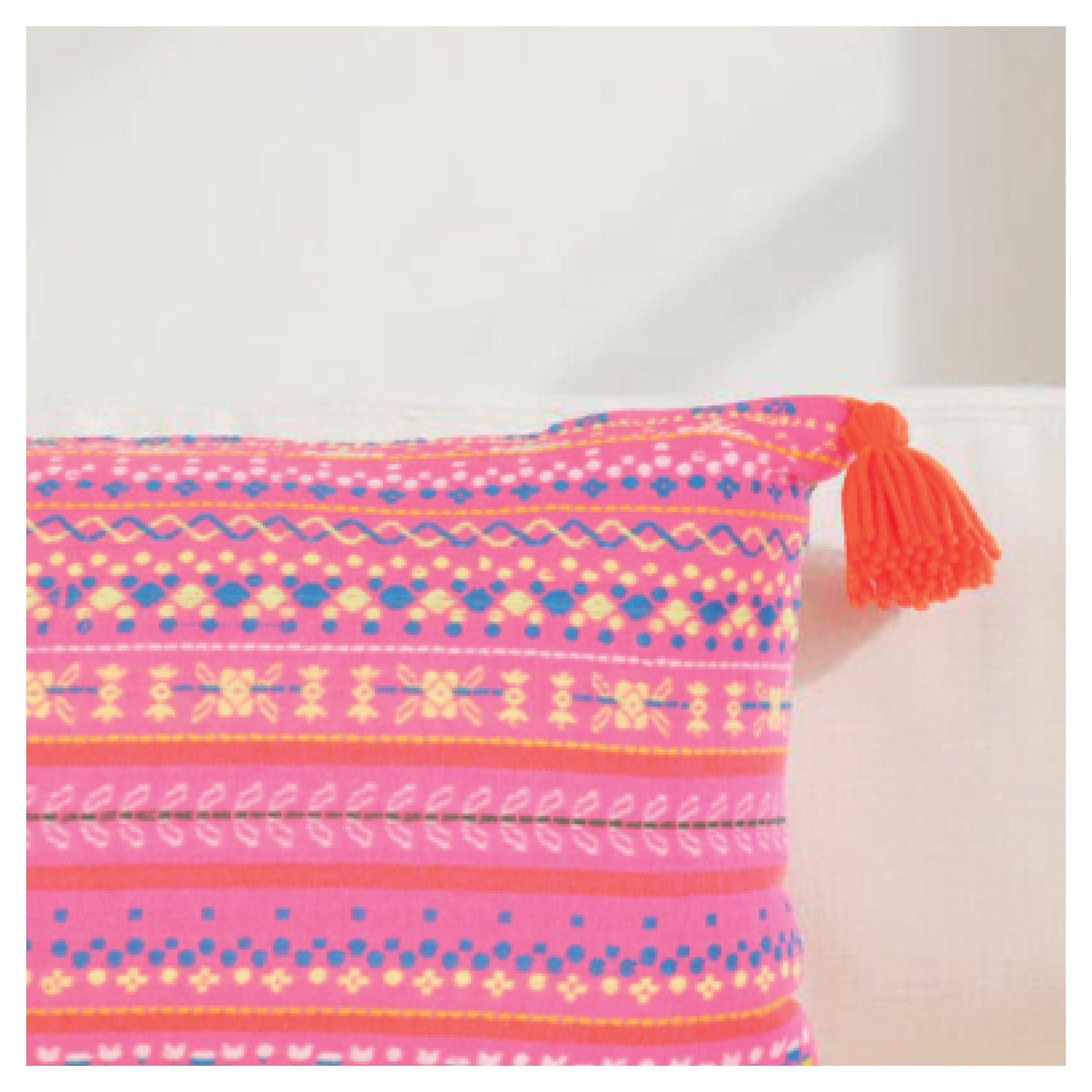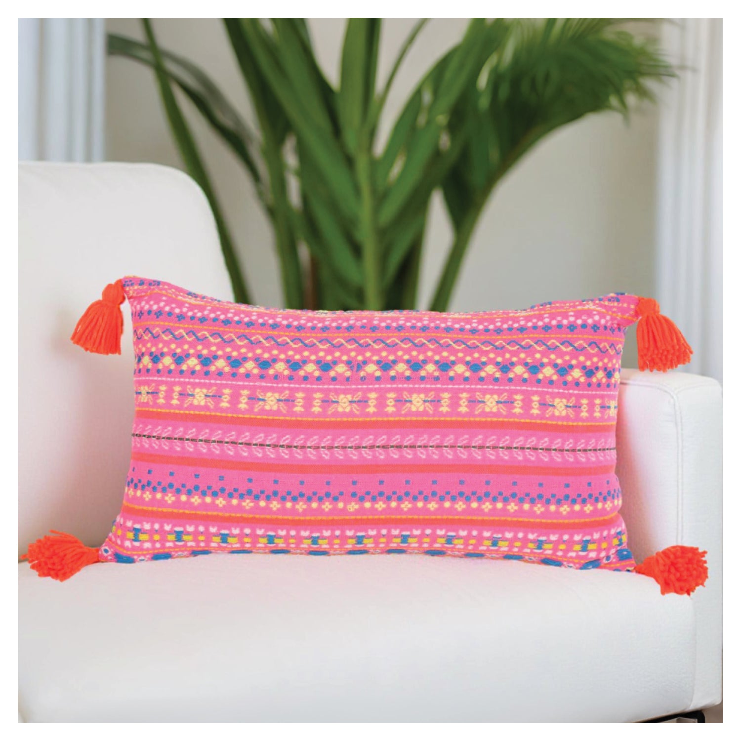 Featuring a vibrant lumbar pillow with a colourful geometric pattern in Light Pink , accented with handcrafted tassels.