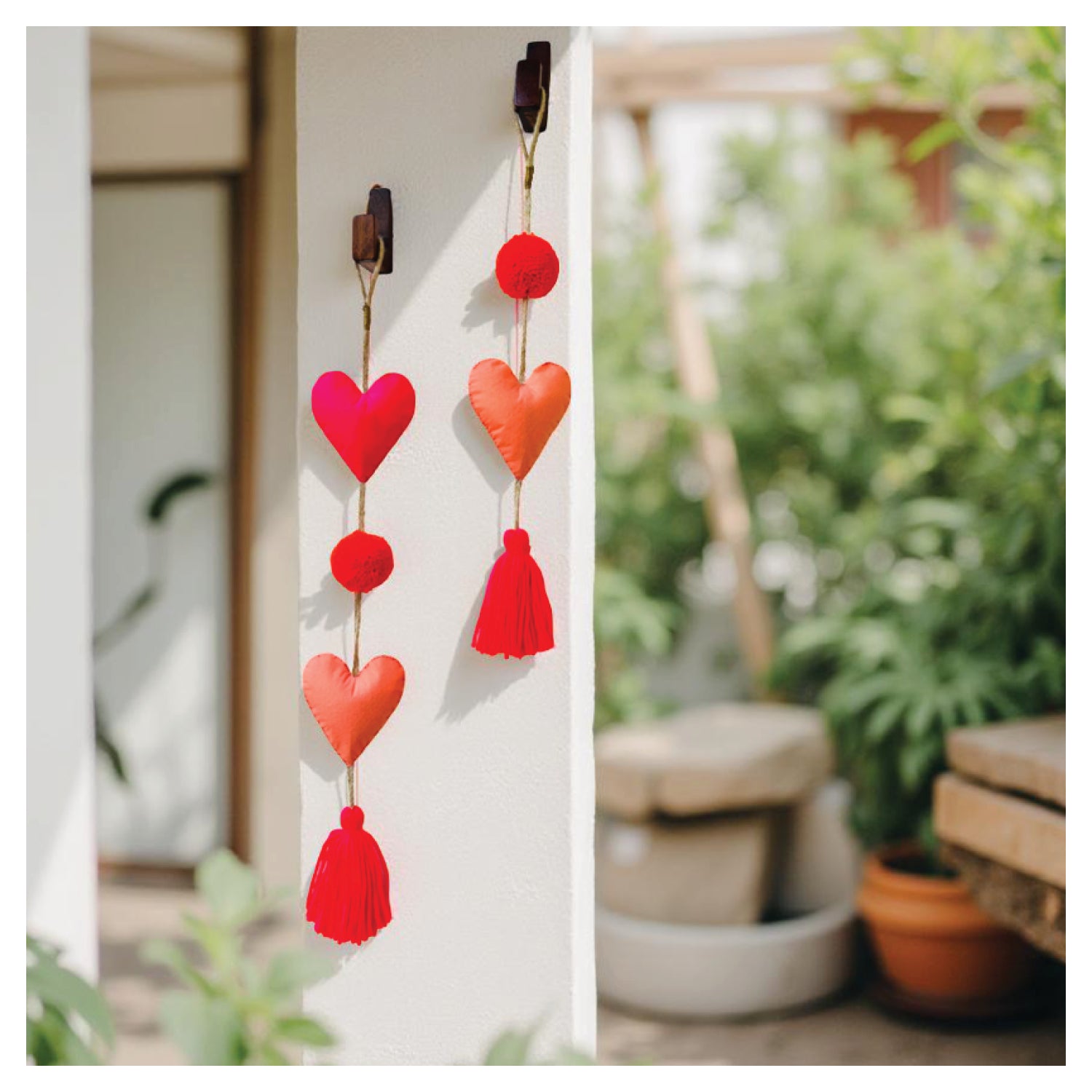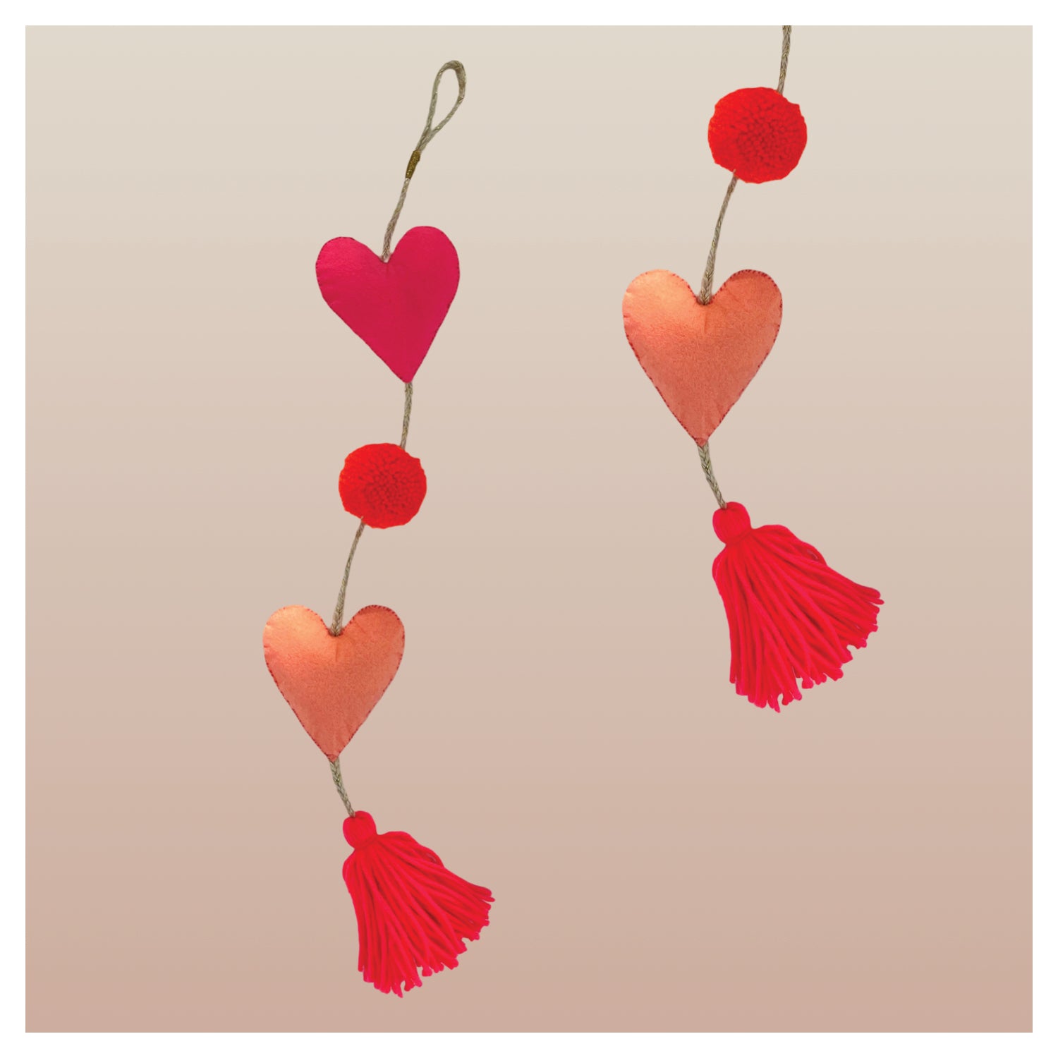 Featuring a set of two handcrafted wall hangings with a heart motif and tassel details in playful hues of vibrant pink and peach.