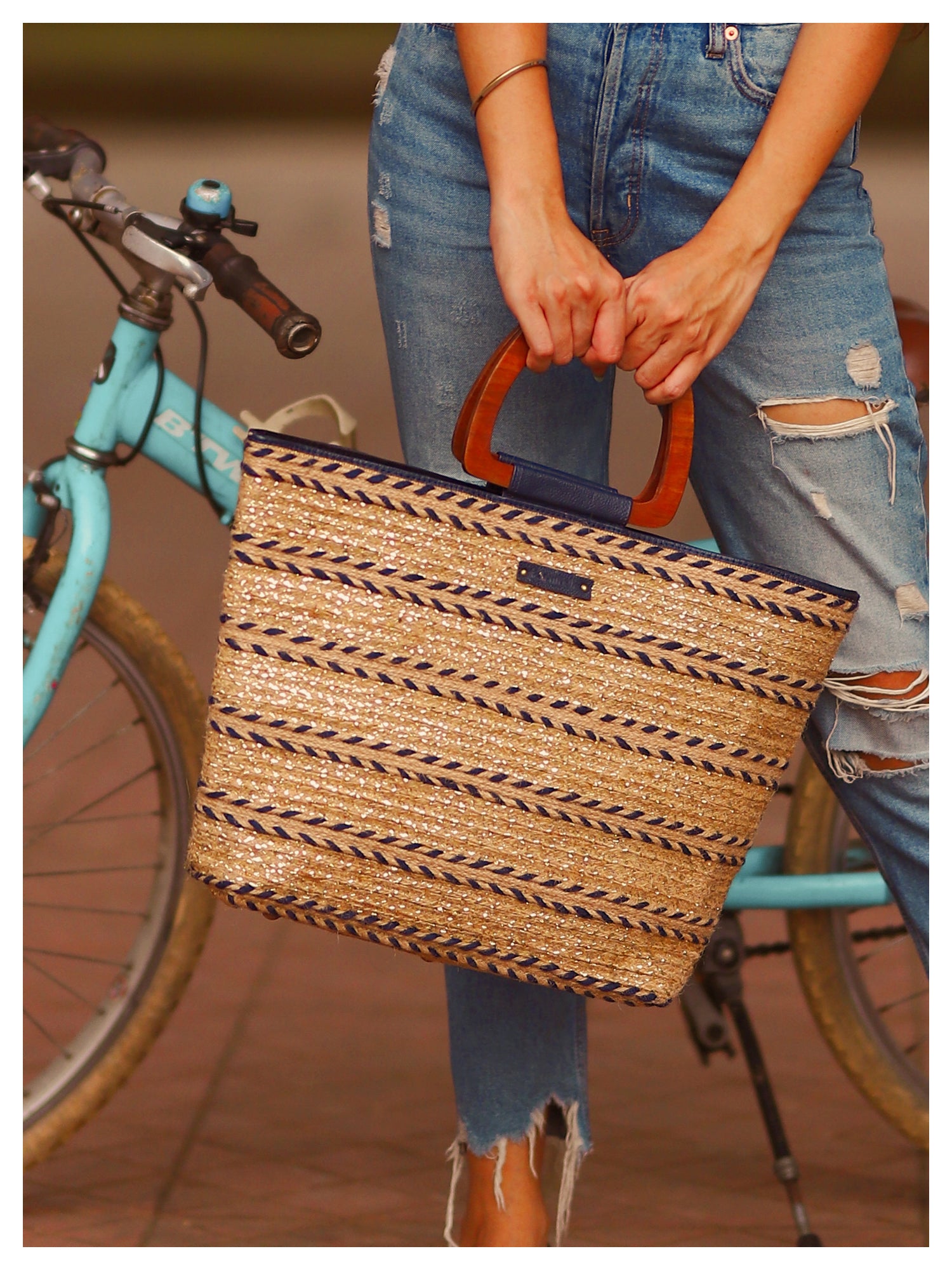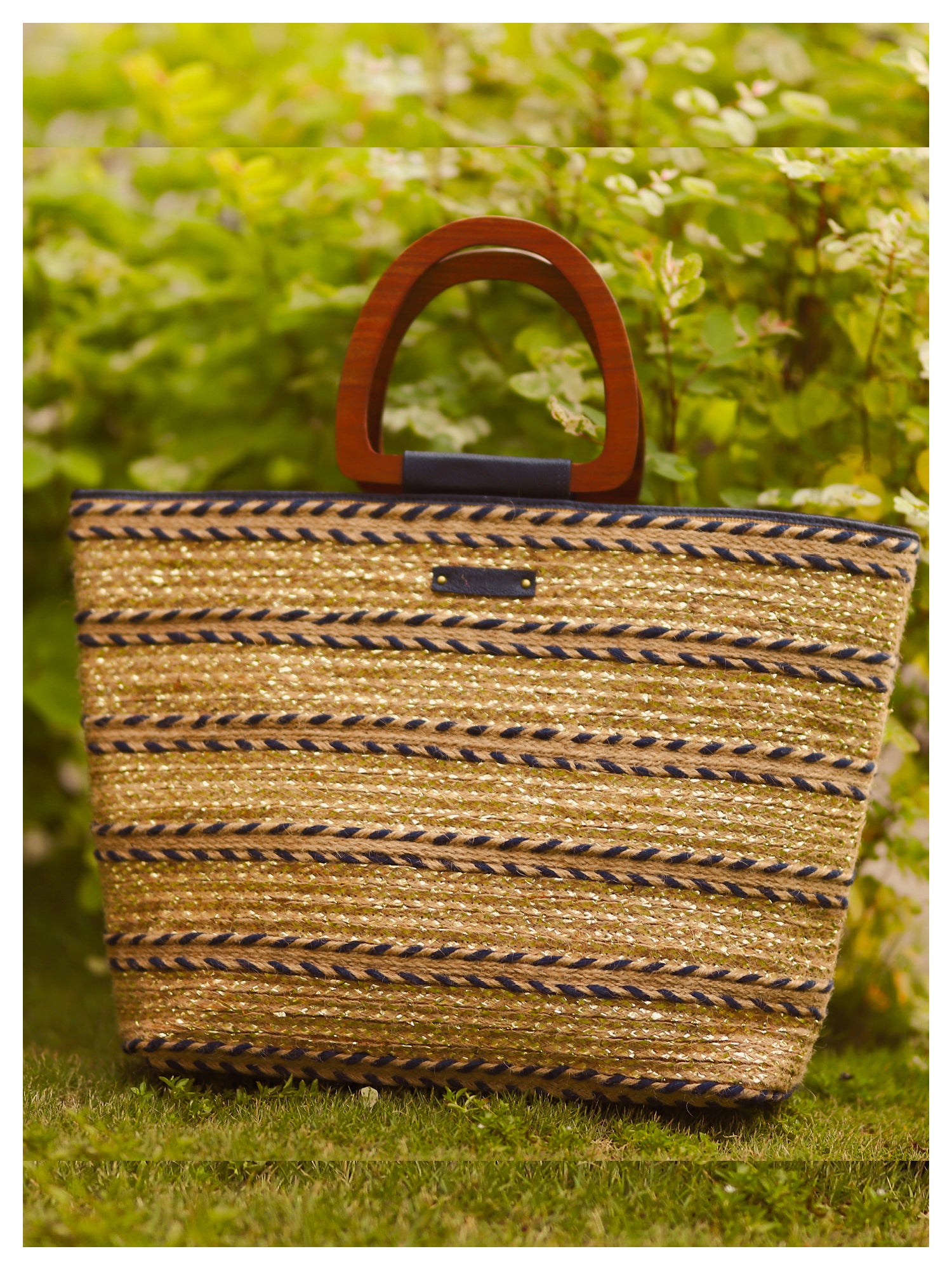 AMALFI is a gorgeous tote bag, artisan made with hand woven jute in an interesting juxtaposition of shimmering and matte jute braids. It comes together beautifully with navy leather and polished wood handles. The perfect tote for an impromptu trip to the beach, or the mall, for a coffee date or brunch with the girls!