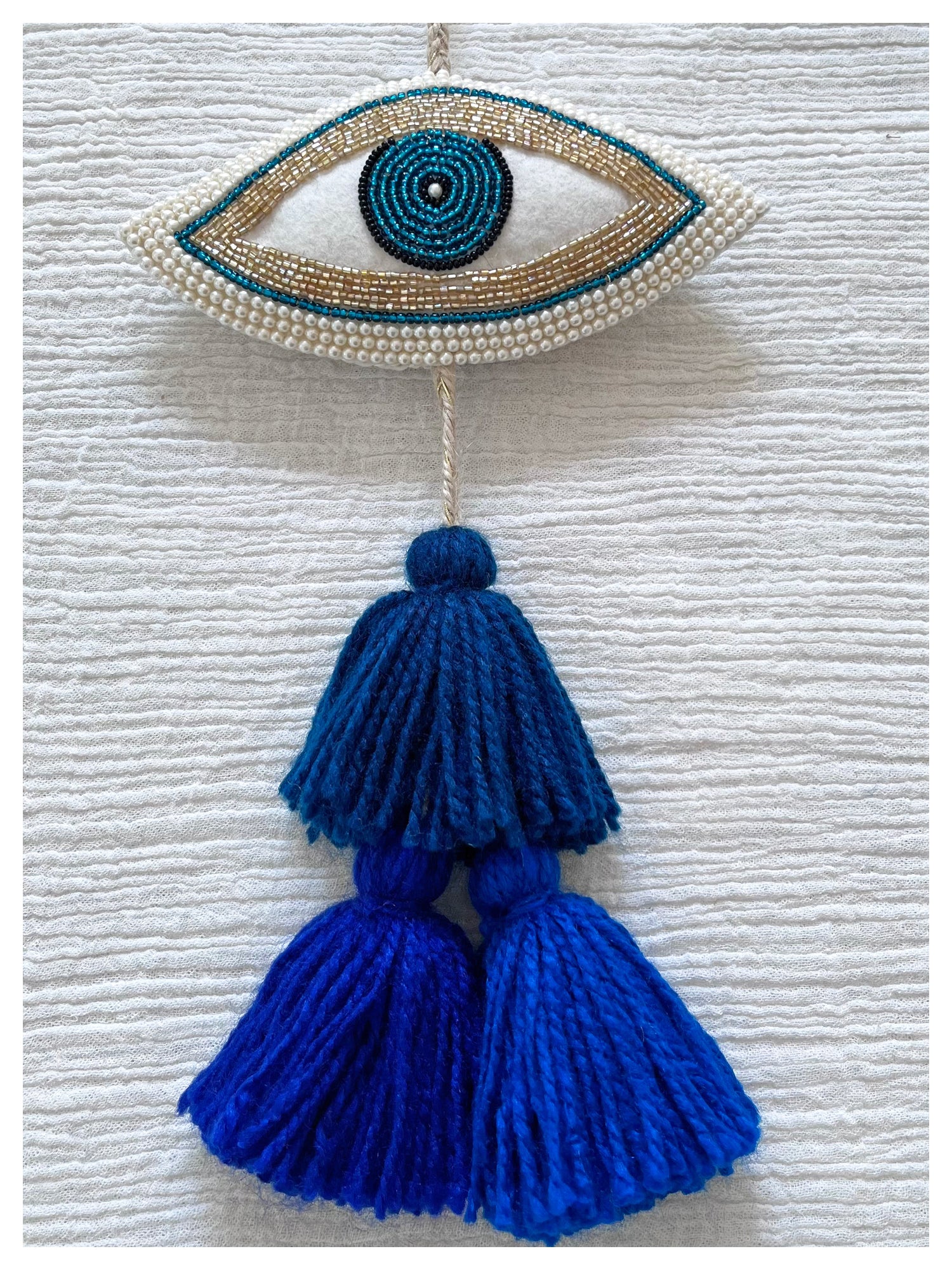 Featuring a hand embroidered eye flanked by a medley of dancing tassels in rich shades of blue.