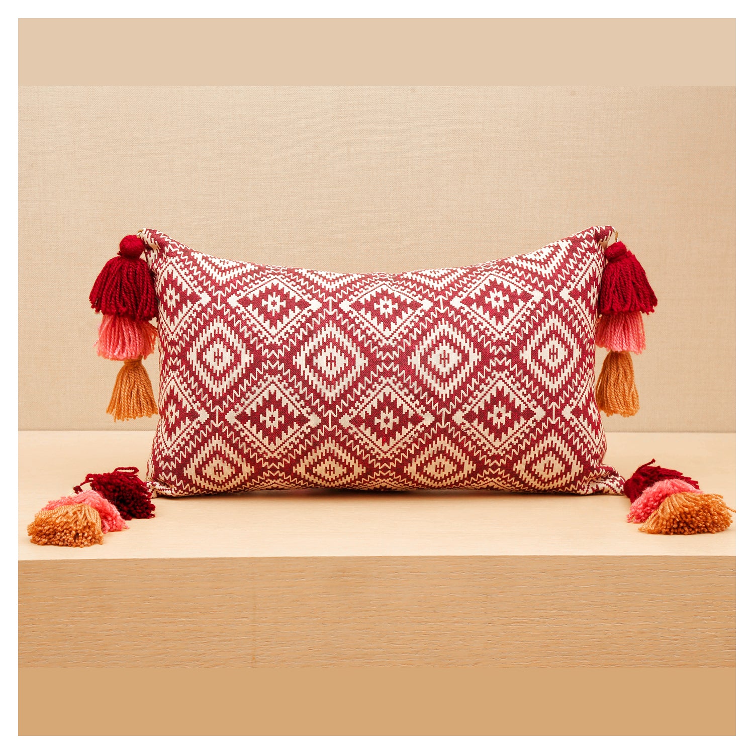 Featuring a Deep plum cotton jacquard lumbar pillow with a rich geometric diamond pattern , accented with handcrafted tassel details on the edges.