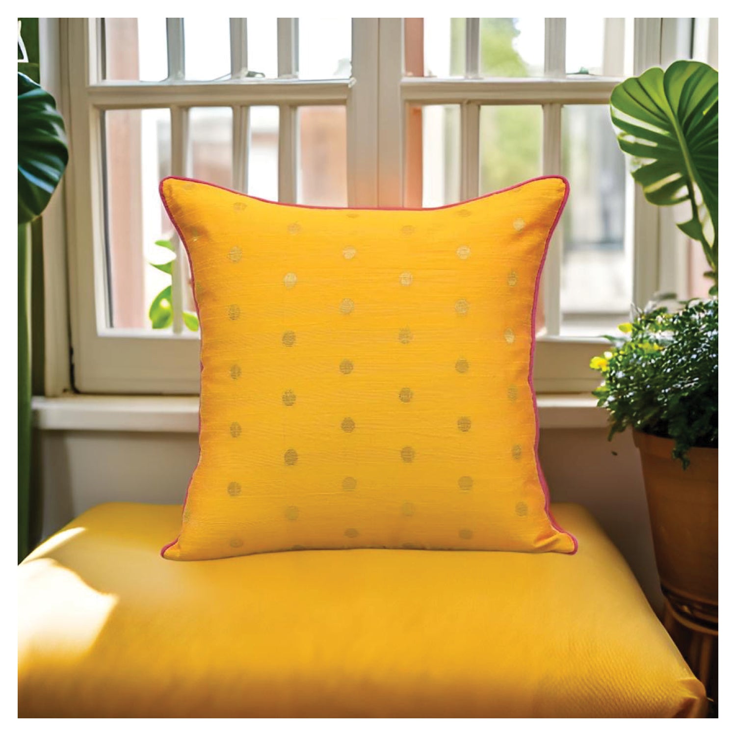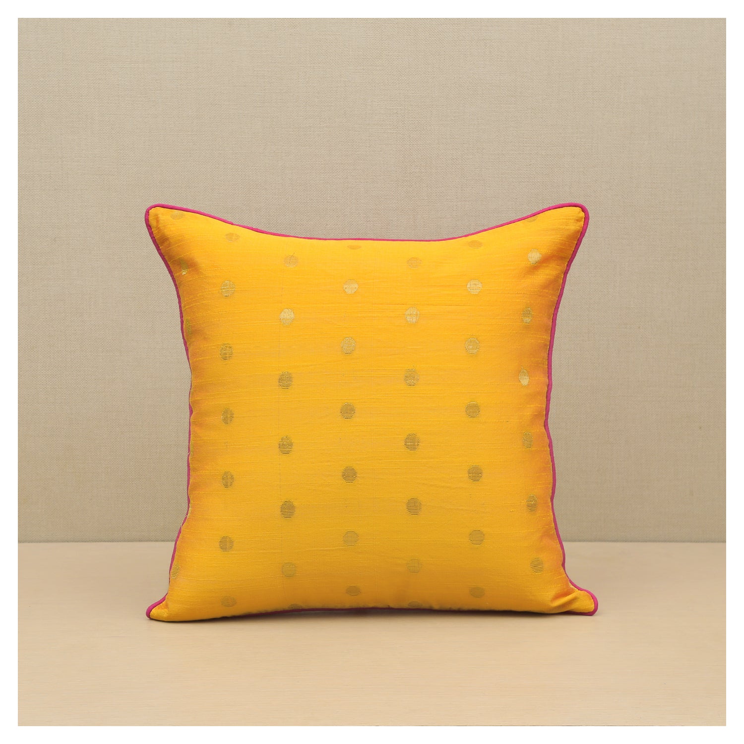 Featuring a cotton silk cushion in Yellow with opulent gold dots woven intricately in the fabric , a bright contrast piping and a playful tie-up closure.