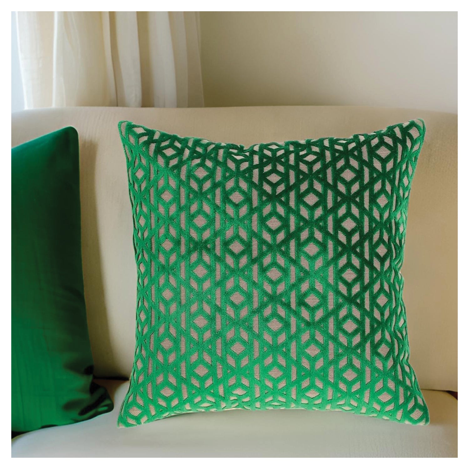 Designed in a gorgeous emerald green velvet jacquard in a striking geometric pattern, these statement cushions add elegance and a festive aura to the décor.