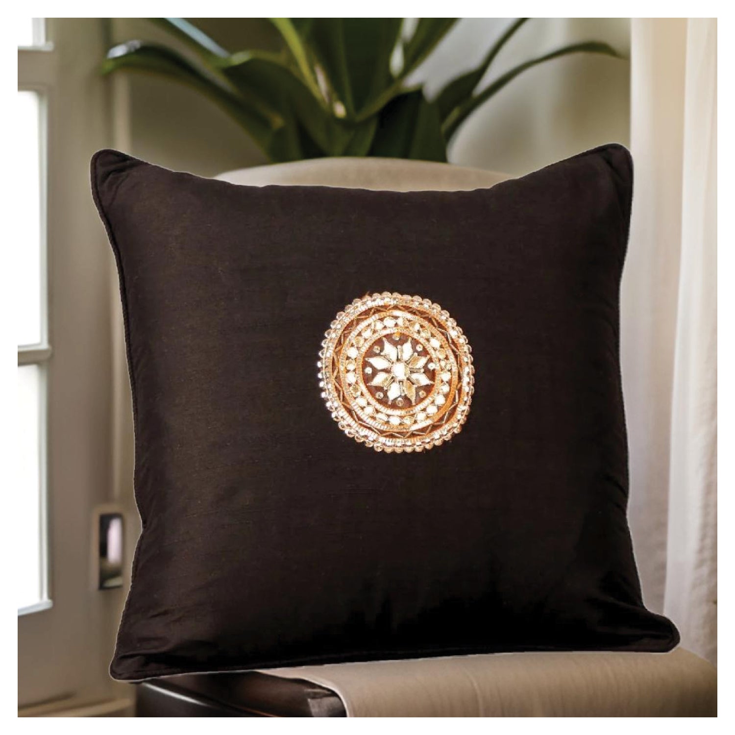 Featuring a Black cotton silk cushion with a delicately embroidered gota motif , self piping finish and a playful tie-up closure.