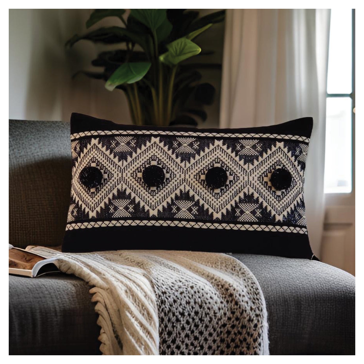 Designed in a beautiful black jacquard with a white Aztec inspired border, accented with handcrafted black and silver pompoms, this classic black lumbar pillow adds warmth, texture and charm to the décor