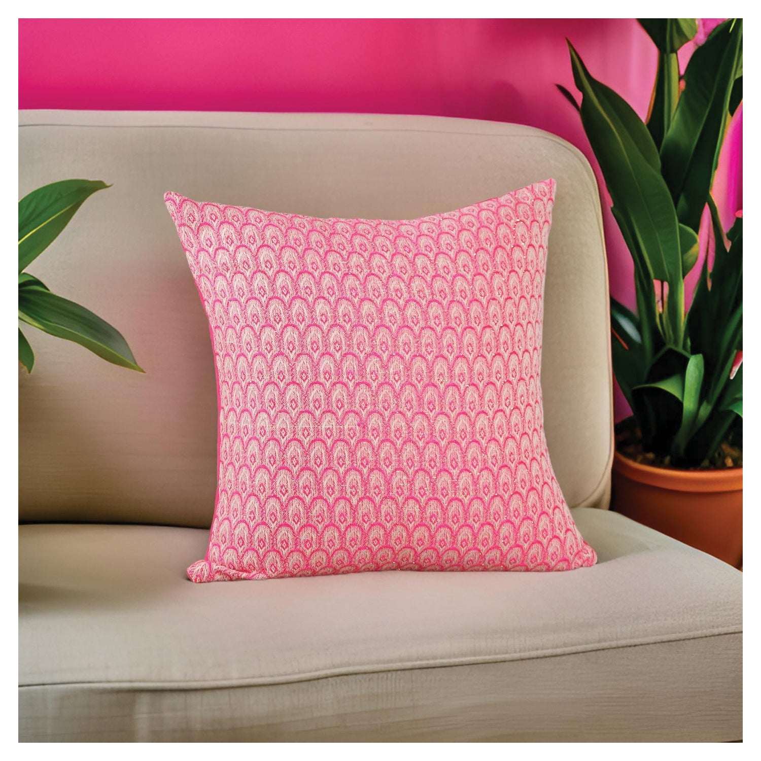 Featuring a statement cushion with a soft sparkling scallop pattern on  vibrant pink. Adds rich texture and a pop of luxuriant color - perfect for the festive season.