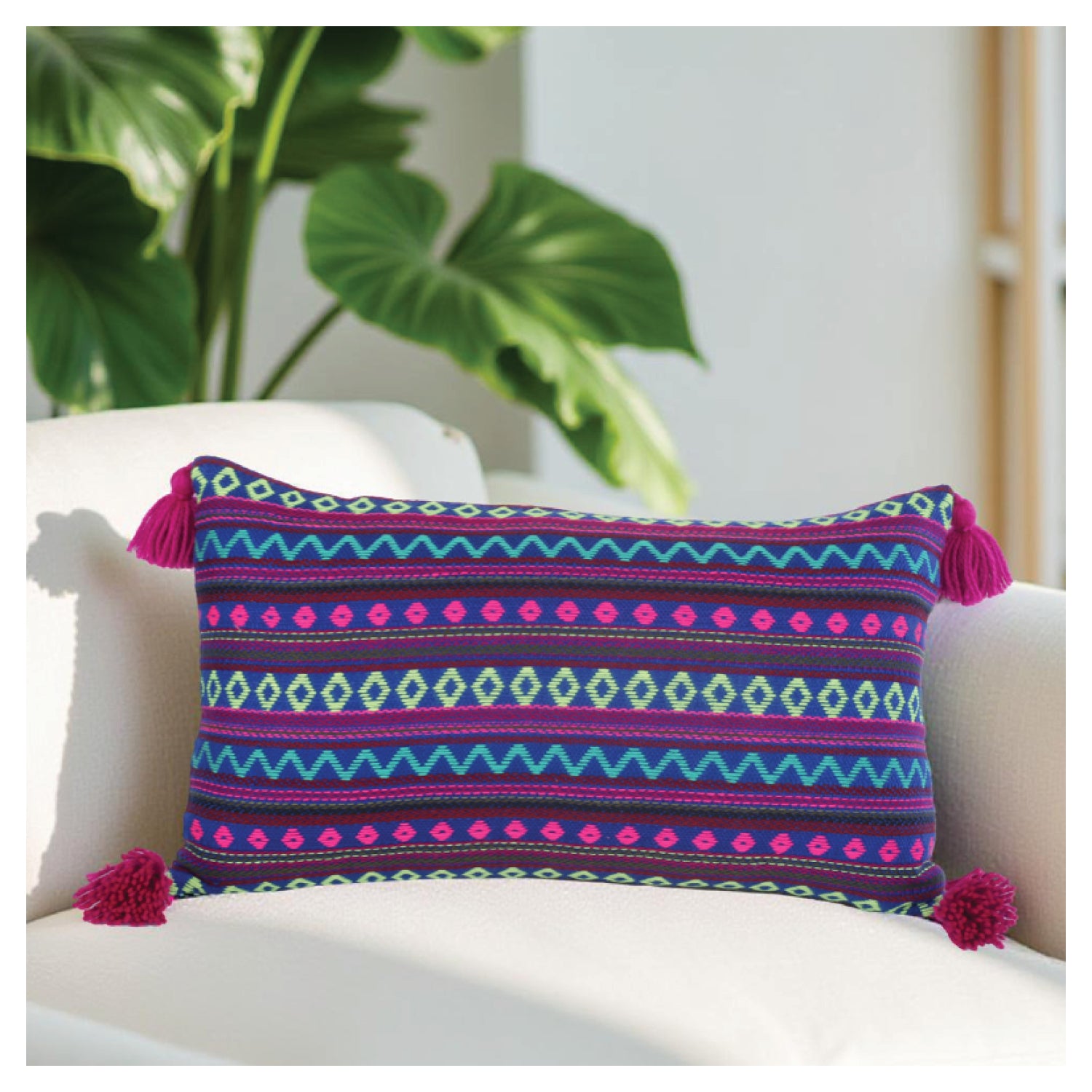 Featuring a vibrant lumbar pillow with a chevron striped geometric pattern in shades of Purple, Royal Blue and Pink , accented with handcrafted tassels.