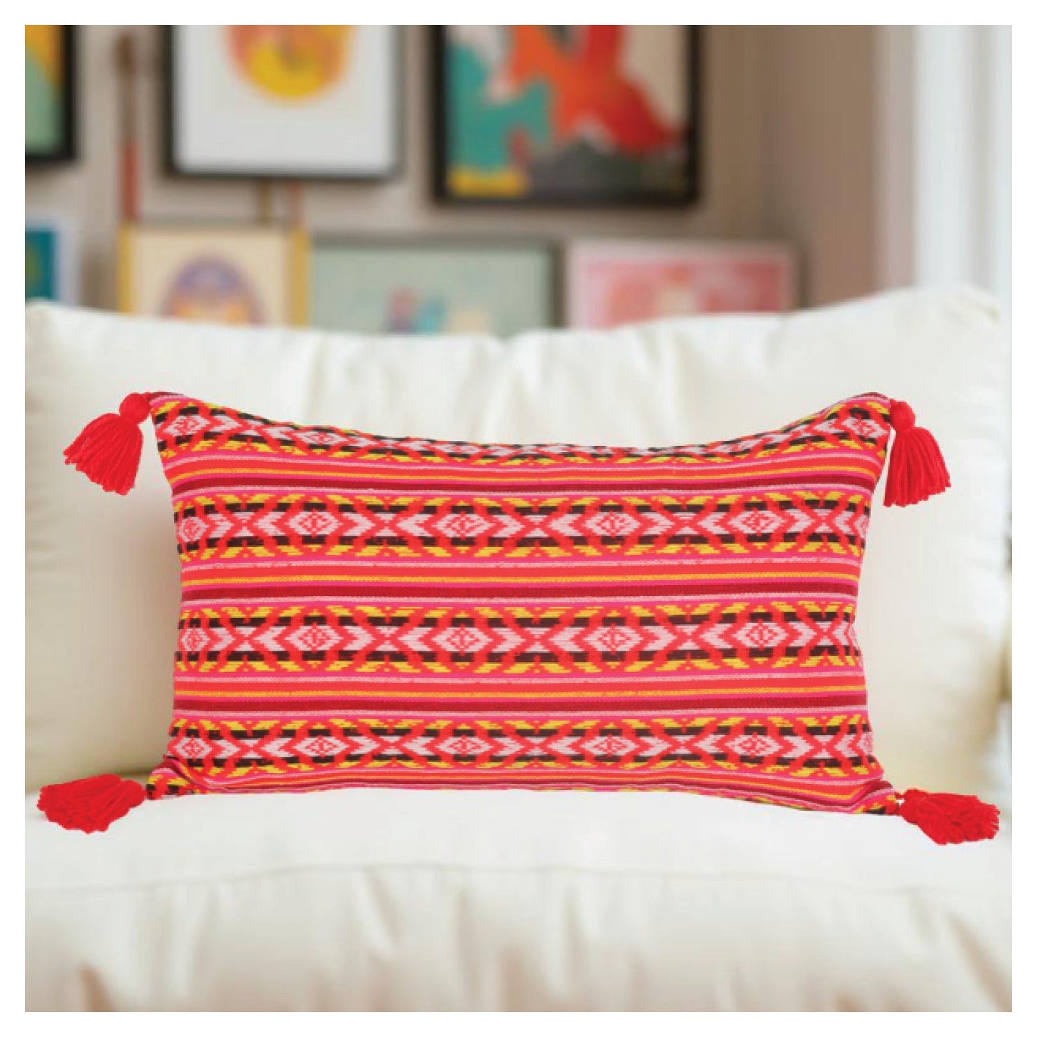 Featuring a vibrant lumbar pillow with a chevron striped geometric pattern in bright Red, accented with handcrafted tassels.