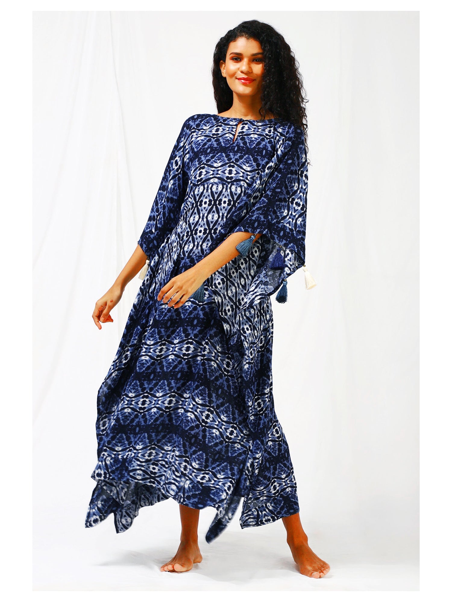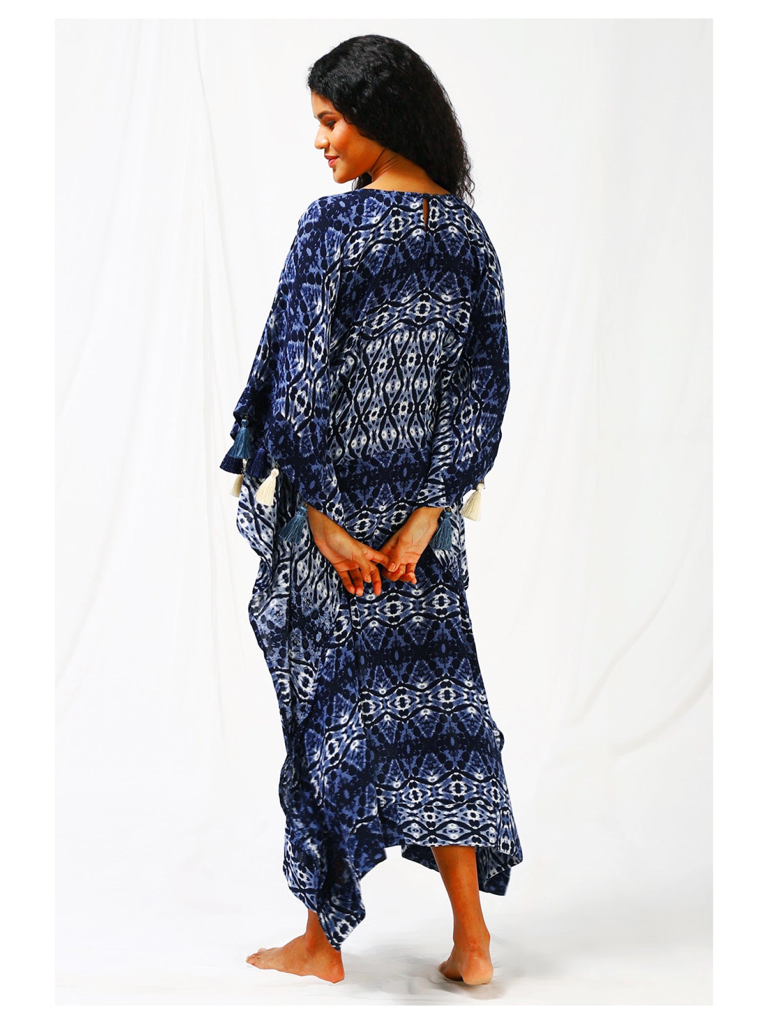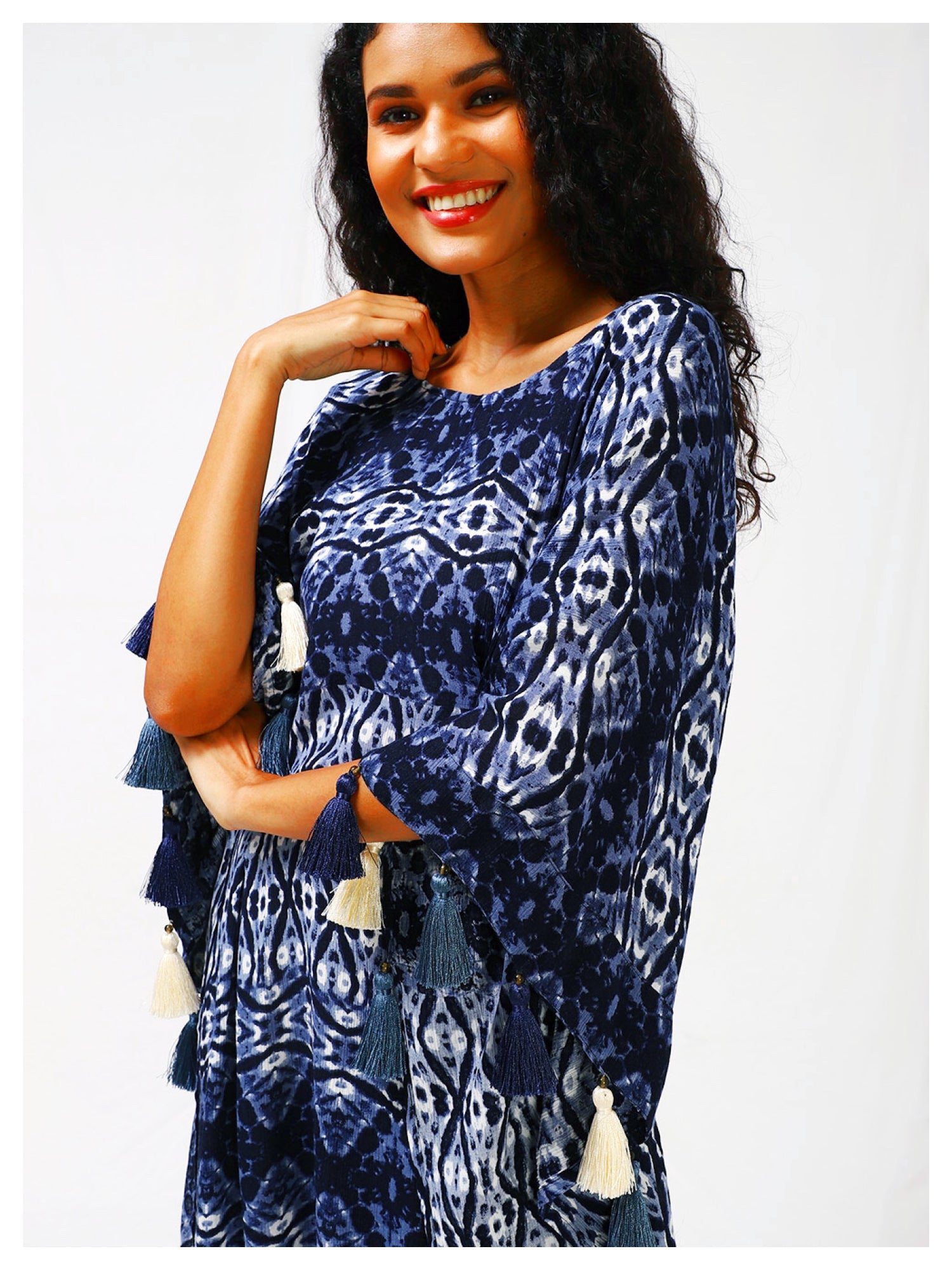 Featuring a long breezy dress with an easy silhouette – in a striking navy and white tie dye print. Pullover styling, relaxed loose fit with a pleat detail on the waistline. Accented with monochromatic tassels, this boho-chic dress is lightweight, fun and versatile.