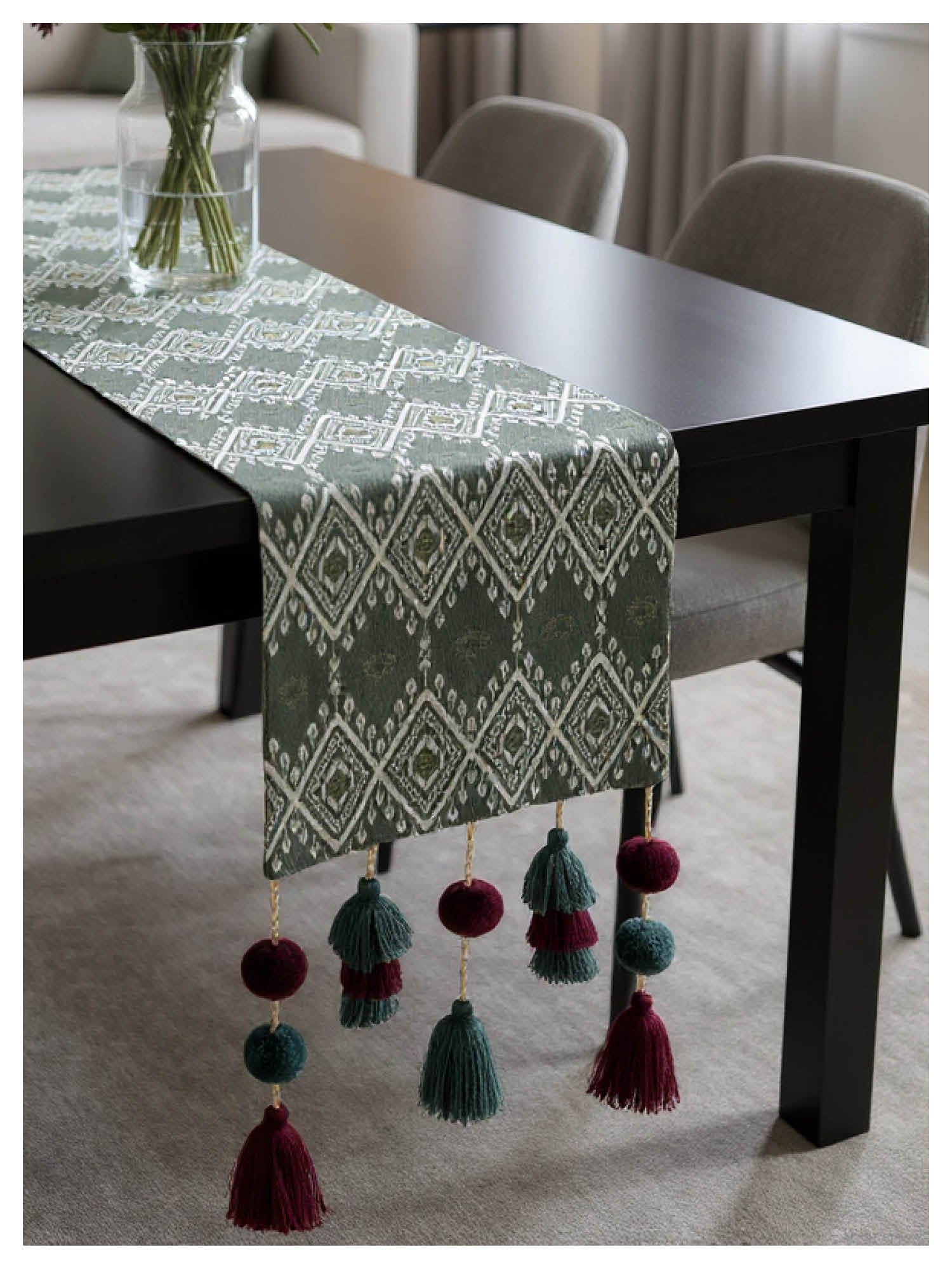 This striking table runner in a woven Aztec patterned jacquard - with gorgeous tassel and pom-pom accents is a perfect addition to the dining table for a statement making tablescape!